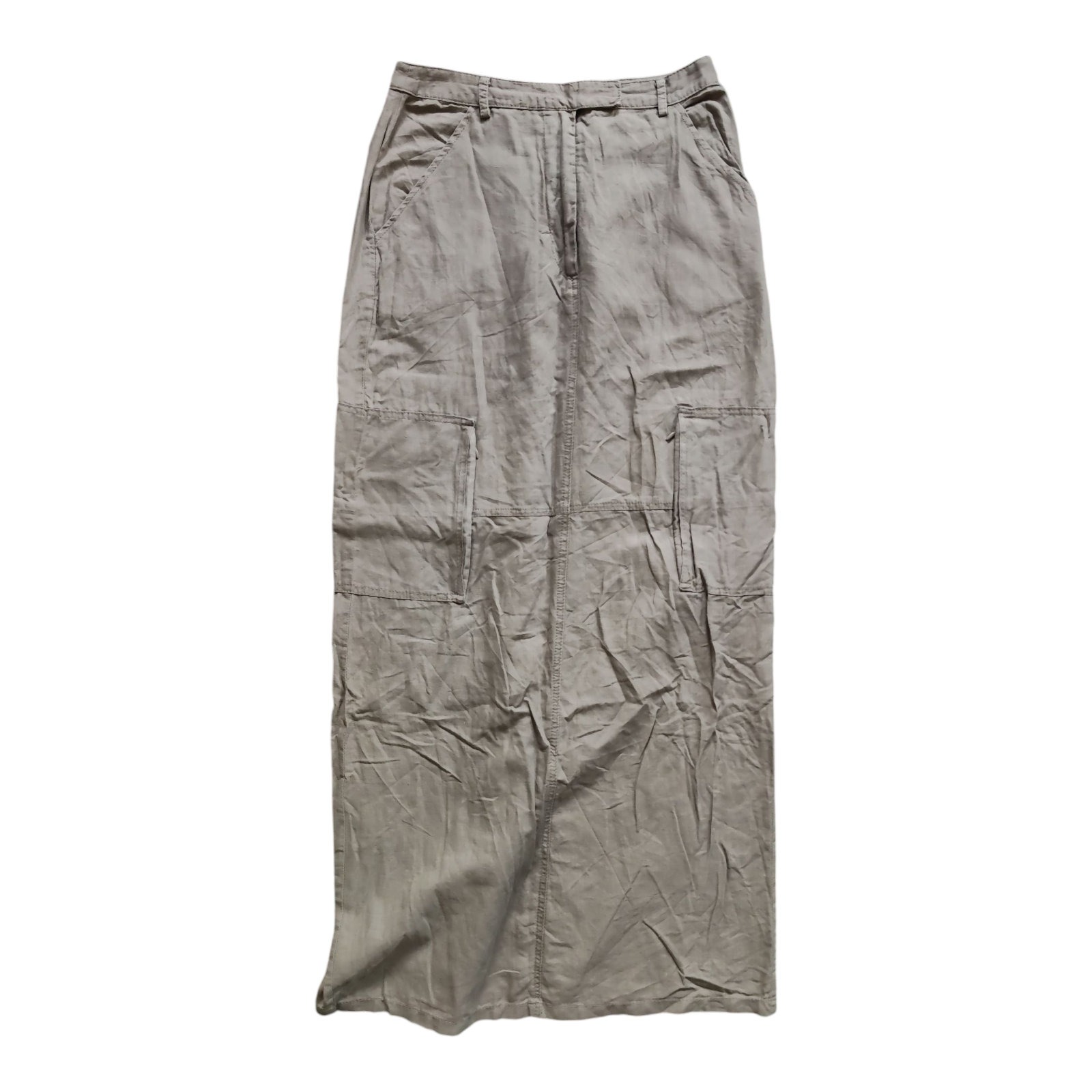 Besonders hervorzuheben sind die großen Taschen, vier vorne und zwei hinten, die nicht nur funktional, sondern auch modisch sind. Dieser gebrauchte Rock ist trotz seines Zustands in einwandfreiem Zustand und frei von jeglichen Beschädigungen. Er ist maschinenwaschbar, kann jedoch nicht im Trockner getrocknet werden und benötigt beim Bügeln hohe Temperaturen, um seine Form zu behalten.